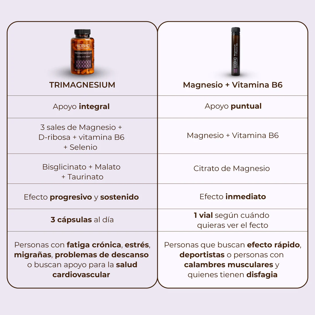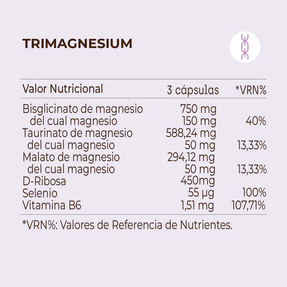 Fórmula avanzada con tres formas estratégicas de magnesio de alta biodisponibilidad (bisglicinato, malato y taurinato) combinadas con D-ribosa, vitamina B6 y selenio. Diseñada para ayudar a disminuir el cansancio y la fatiga, favorecer la recuperación muscular y mejorar la calidad del descanso. Un enfoque integral que contribuye al equilibrio del sistema nervioso y a la función cognitiva, tiroidea y cardiovascular. Un magnesio completo sin molestias gastrointestinales.